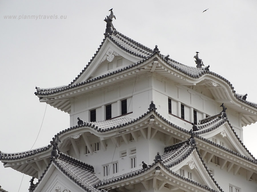 On the UNESCO side, we can find the following description: “Himeji-jo is the finest surviving example of early 17th-century Japanese castle architecture, comprising 83 buildings with highly developed systems of defence and ingenious protection devices dating from the beginning of the Shogun period. It is a masterpiece of wood construction, combining function with aesthetic appeal, both in its elegant appearance unified by the white plastered earthen walls and in the subtle relationships between the building masses and the multiple roof layers.”