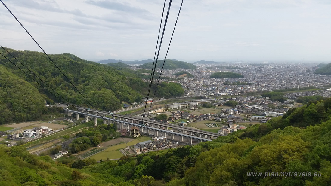 The journey takes less than 4 minutes, and the ropeway stops at 370 m above sea level. The views through the gondola windows are breathtaking, as when there is nice weather, you can see not only the nearby city of Himeji but also the slightly further city of Kobe and—at the very far end—the city of Osaka.