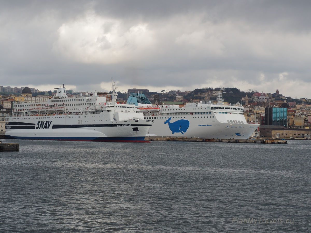 As the ferry departs, head to the back of the ship to catch Naples’s view from the sea. The sight is breathtaking! You can see the port, massive cruise ships, military barracks, the rear of Castel Nuovo, and the towering Castel Sant’Elmo above the city.