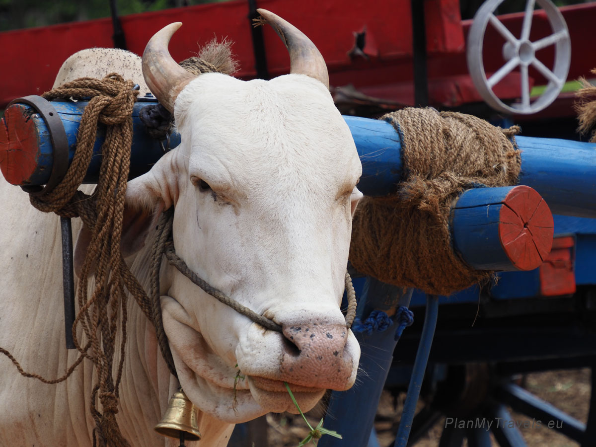 First, we rode in an ox cart, passing rice fields and houses hidden among lush tropical vegetation.