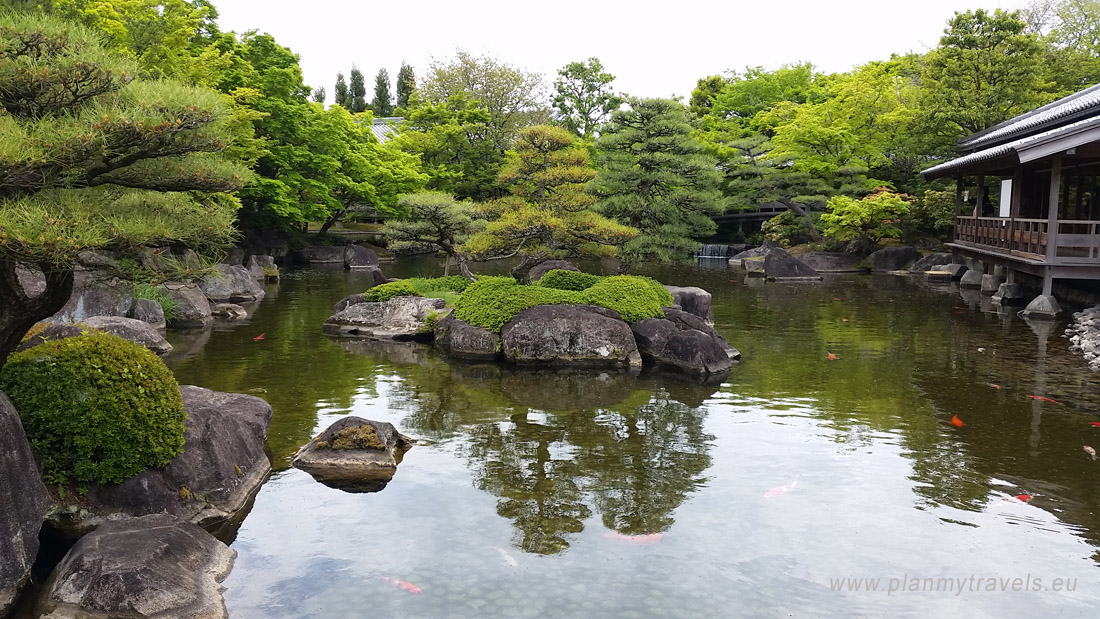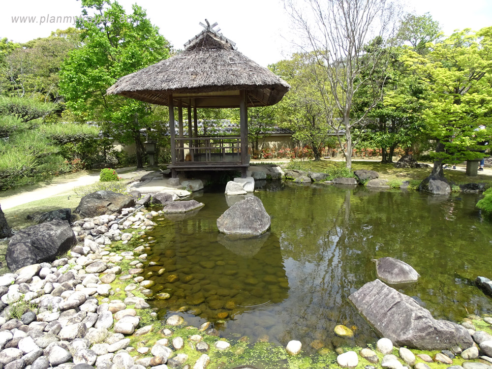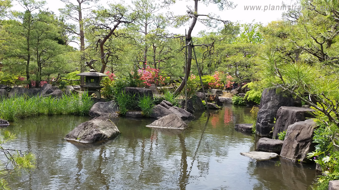 - The garden with a hill and pond is built in the traditional Japanese landscape garden style. There, you can see a tortoise-shaped rock and a Japanese crane-shaped stone slab.