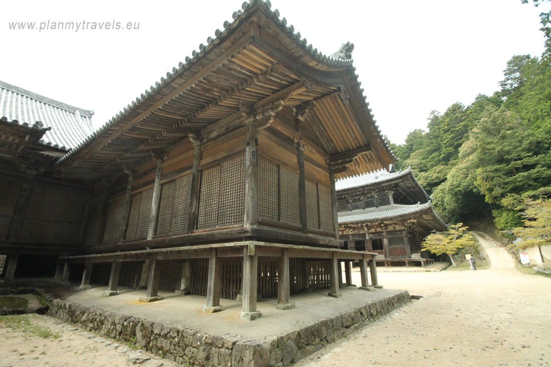 Another five-minute walk along dense forest paths leads to the three wooden halls known as Mitsunodo. All of them have been classified as an “Important Cultural Property”.
