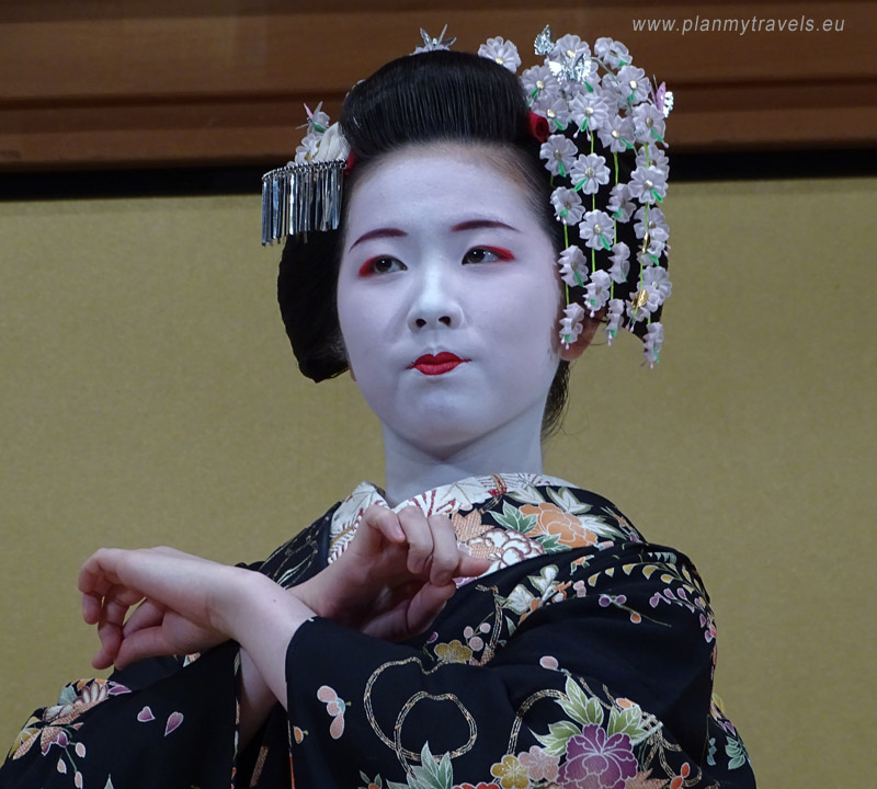 The second dance is called Mai, and its place distinguishes it. This art was part of the Noh Theater and was played primarily in small private rooms rather than on the stage. Kyomai—the Kyoto style—was born in the 17th century and developed mainly at the imperial court banquets as an elegant and dignified art. This dance is primarily performed by maiko dancers and by the geisha themselves.