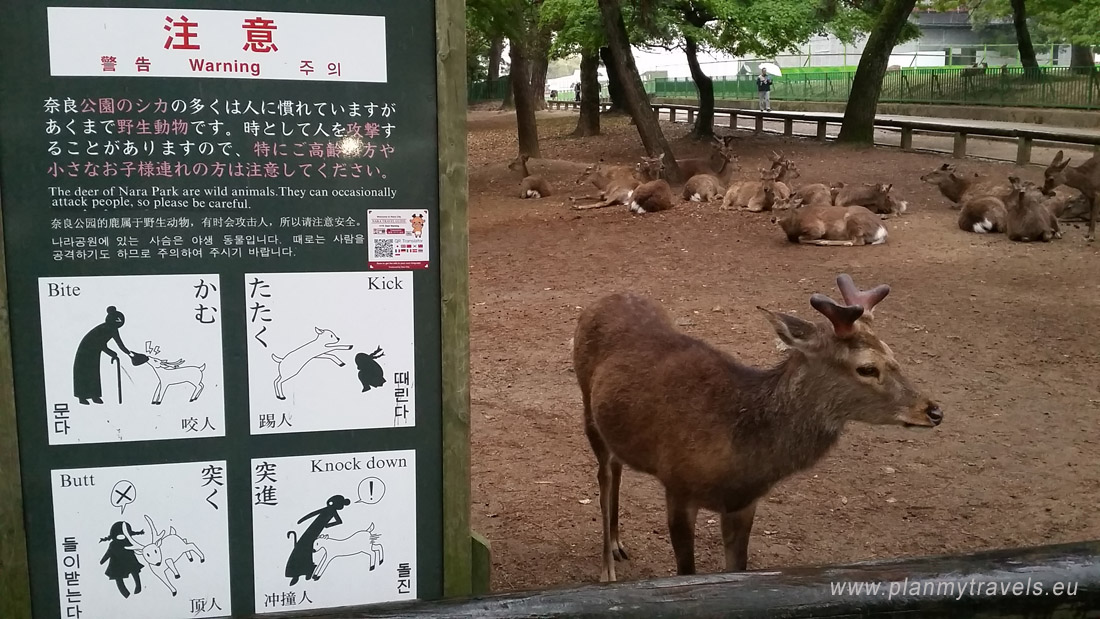 Fallow deer and roe deer walk the city streets and eat grass, bamboo leaves and buds. Tourists can also feed them with small, tasty deer crackers (Shika Senbei), 150 yen for a small package (1,3$). But be careful, as deer learned how to ask or demand tourists to buy the cookies, and they can do it quite pushy. It has happened in the past, pedestrians were injured by sharp-pointed horns, so today most of the deer have their horns cut off. There are information boards around the park, which can be easily understood by looking at the pictograms, which show how dangerous it can be to have close contact with those wild animals.