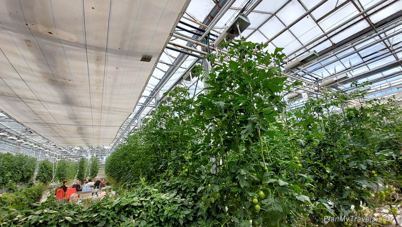 Magia tego miejsca polega na tym, że stoliki ustawione są wewnątrz szklarni, w której rosną pomidory! W alejkach obok, pracują pracownicy szklarni, którzy wykonują wszystkie codzienne czynności: sadzenie, pielęgnacja, zbieranie pomidorów. Czekając na stolik, można przejść się po szklarni i przyjrzeć się jej z bliska.