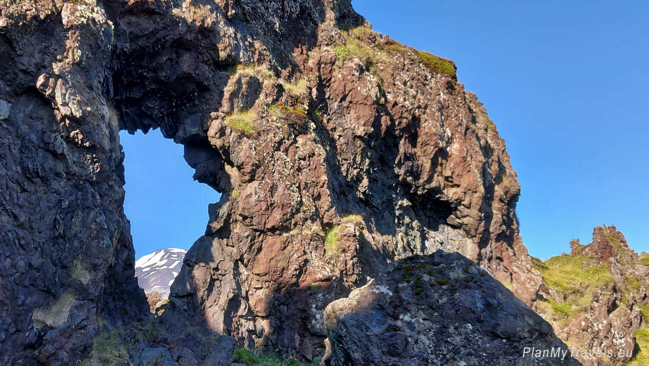 Droga na plażę skręca w prawo i wiedzie przez środek skał wulkanicznych. Po drodze warto zatrzymać się przy Gatklettur, czyli skale „z oknem”, przez które widać m.in. lodowiec Snæfellsjökull.