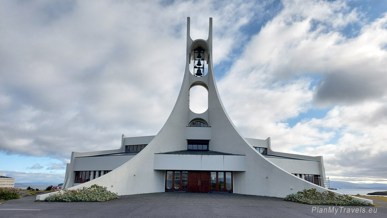 Futurystyczny kościół Stykkisholmkirkja. Kościół zwraca uwagę nie tylko nowoczesną architekturą i imponującym rozmiarem, ale również niezwykłym położeniem.