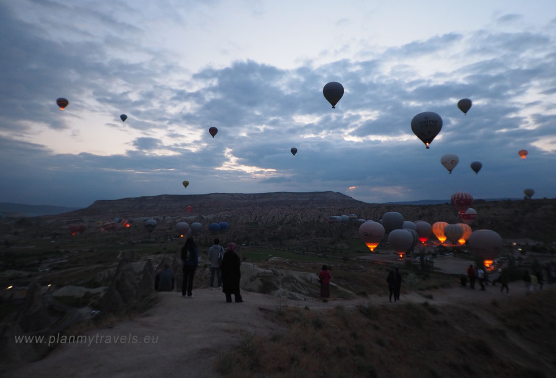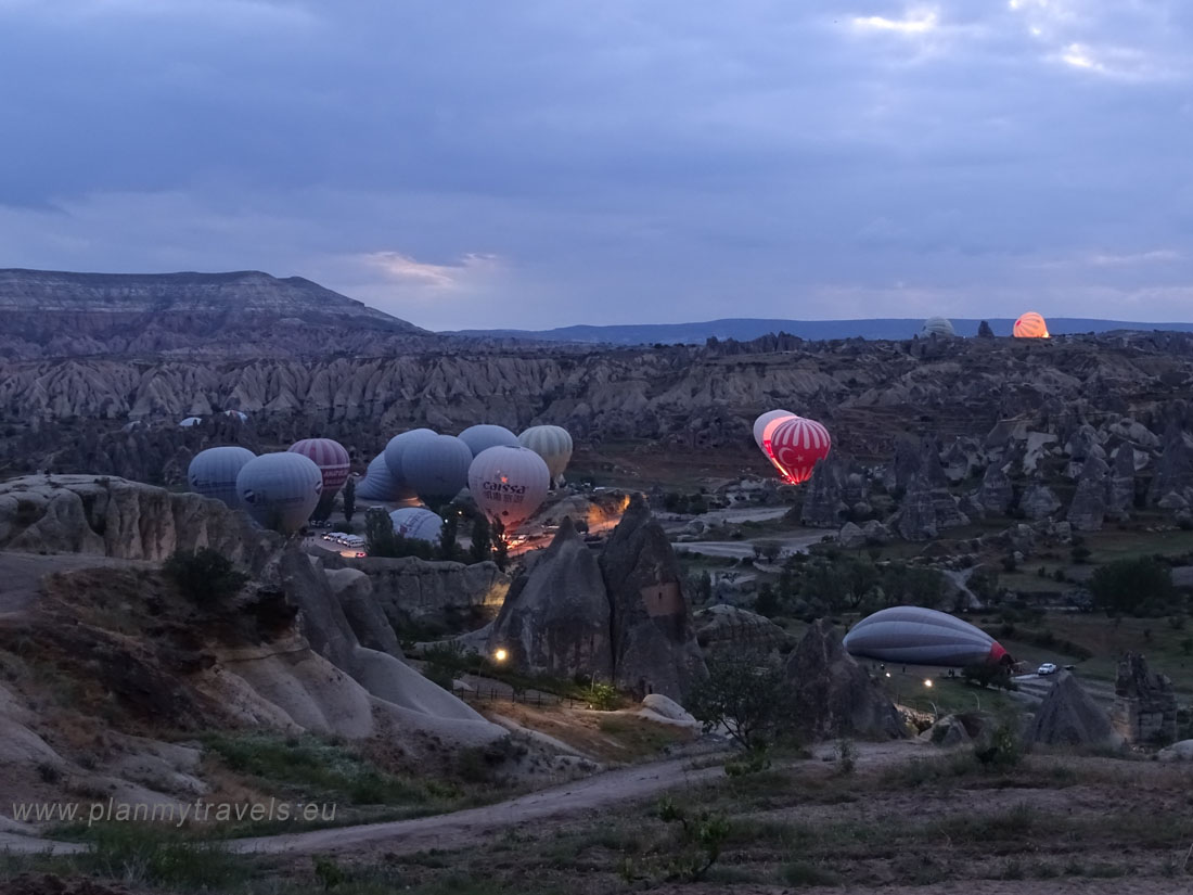 Jeśli tego dnia nie lecicie balonem, ale wiecie, że balony wystartują o 5.00 rano (tą informację, można zawsze dostać w recepcji hotelowej) – warto wstać rano i wybrać się na punkt widokowy, z którego można zaobserwować startujące balony. To doświadczenie niemal tak silne jak sam lot balonem i uważam, że będąc w Kapadocji warto przeżyć obydwa. W Goreme taki punkt widokowy (Sunset Point) znajduje się na wschodzie miasta (adres na GPS: Sunset Aydın Kırağı Seyir Yeri), z centrum idzie się tam ok 15-20 minut (wejście pod górkę). Warto tam przyjść przed 5.00 rano, jeszcze przed wschodem słońca. Widok 150 balonów podgrzewanych gorącym powietrzem i wznoszących się niemal jednocześnie – jest niesamowity. Przez pół godziny można robić zdjęcia i czuć cały czas niedosyt.