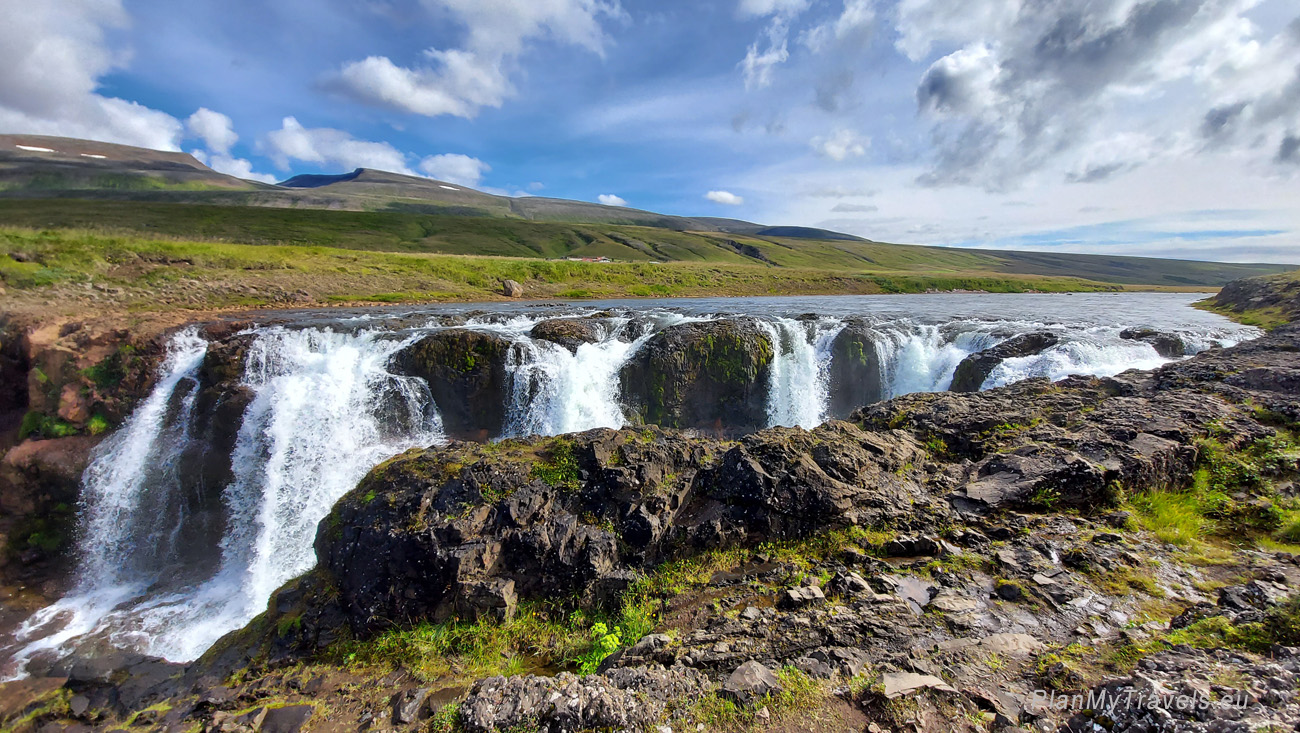 Ok. 30 km przed Akureryi jest nasz ostatni postój. Tuż przy głównej drodze znajduje się kolejny wspaniały wodospad Godafoss. Jest to zdecydowanie jeden z najbardziej imponujących wodospadów na Islandii♥. Ma kształt wielkiej podkowy i składa się z dwóch strumieni, o łącznej szerokości 30 metrów. Do wodospadu trzeba dojść, a na rzece jest jeszcze kilka ciekawych kaskad wodnych. Tej atrakcji po prostu nie można pominąć, naprawdę robi wrażenie!
