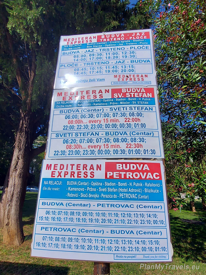 Podróż do Sveti Stefan zajmuje 40 min, a bilet kosztuje 1,5 Euro. Autobusy poranne (między 6:00 a 8:00), odjeżdżają z Budvy co pół godziny. Między 8.00 a 22.00, odjeżdżają co 10 minut. Od 22.00 do 00.00 co 15 minut, a po północy znowu co pół godziny. Ostatni autobus z Budvy odjeżdża o 1:30 w nocy a z Sveti Stefan o 2.00.