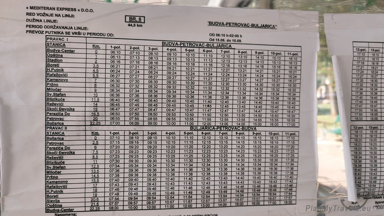 Autobus do Petrovac część trasy pokonuje tą samą drogą jak autobus do Sveti Stefan, ale przystanek Sveti Stefan jest tylko przy drodze głównej a nie w miasteczku. Cała droga do Petrovac zajmuje 1 godzinę, a bilet kosztuje 3 Euro. Autobusy z Budvy odjeżdżają co godzinę, między 8:10 a 23:10, a z Petrovac jeżdżą między 9.10 a 0:10.