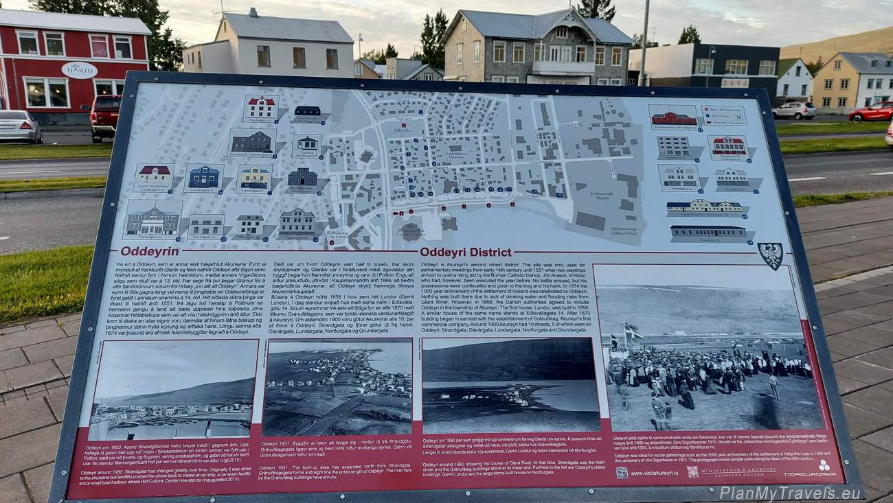 W mieście znajduje się wiele tablic informacyjnych ze zdjęciami i opisami wielu historycznych miejsc. Wiele z nich opisuje ciekawą architekturę lub historię dzielnicy. Najciekawsze przykłady historycznej zabudowy miasta można znaleźć w jego najstarszej części – Innbærinn czy Oddeyri. Każda tablica ma również kod QR z dodatkowymi informacjami.