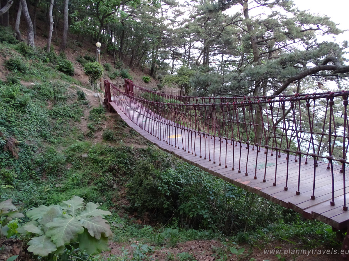 - Naprzeciwko kładki oraz wysp Oryukdo znajduje się małe wzgórze, na którego zboczu powstał park i ukwiecony ogród. Widać, że jest to ulubione miejsce lokalnych mieszkańców. Warto tam wejść. Na szczyt prowadzi ścieżka. Po drodze jest kilka miejsc, w których można usiąść na odpoczynek lub napić się wody ze źródełka. Ze szczytu wzgórza rozpościera się fantastyczny widok na wyspy Oryukdo i morze. Według mnie – to najlepsza atrakcja tego miejsca!