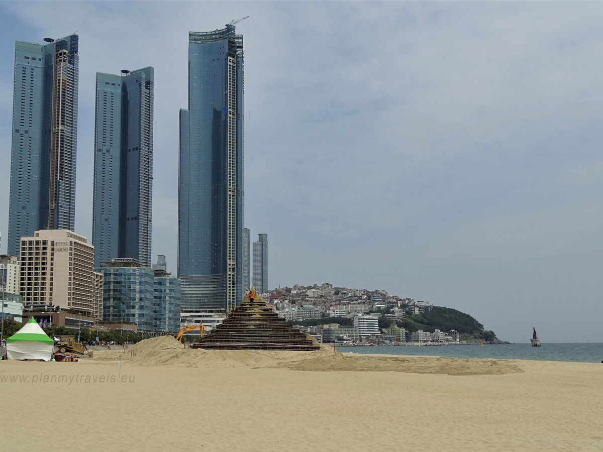Plaża Haeundae uznawana jest za najpopularniejszą plażę w Korei Południowej. Za tą nazwą przemawiają również mocne argumenty: 5-cio gwiazdkowe luksusowe hotele, najlepsze w kraju restauracje, największe w mieście akwarium oferujące pływanie z rekinami oraz port jachtowy. W sezonie letnim, plaża odwiedzana jest przez ponad milion turystów. Plaża przyciąga wieloma atrakcjami: letnie festiwale, koncerty, imprezy tematyczne (np. konkurs rzeźb z piasku – jak na zdjęciach). Plaża rozciąga się na długości 1,5 km i szerokości od 30 do 50 m. Warto ją odwiedzić i poczuć jej atmosferę – zwłaszcza, że oficjalnie uznaje się ją również za najczystszą w mieście.