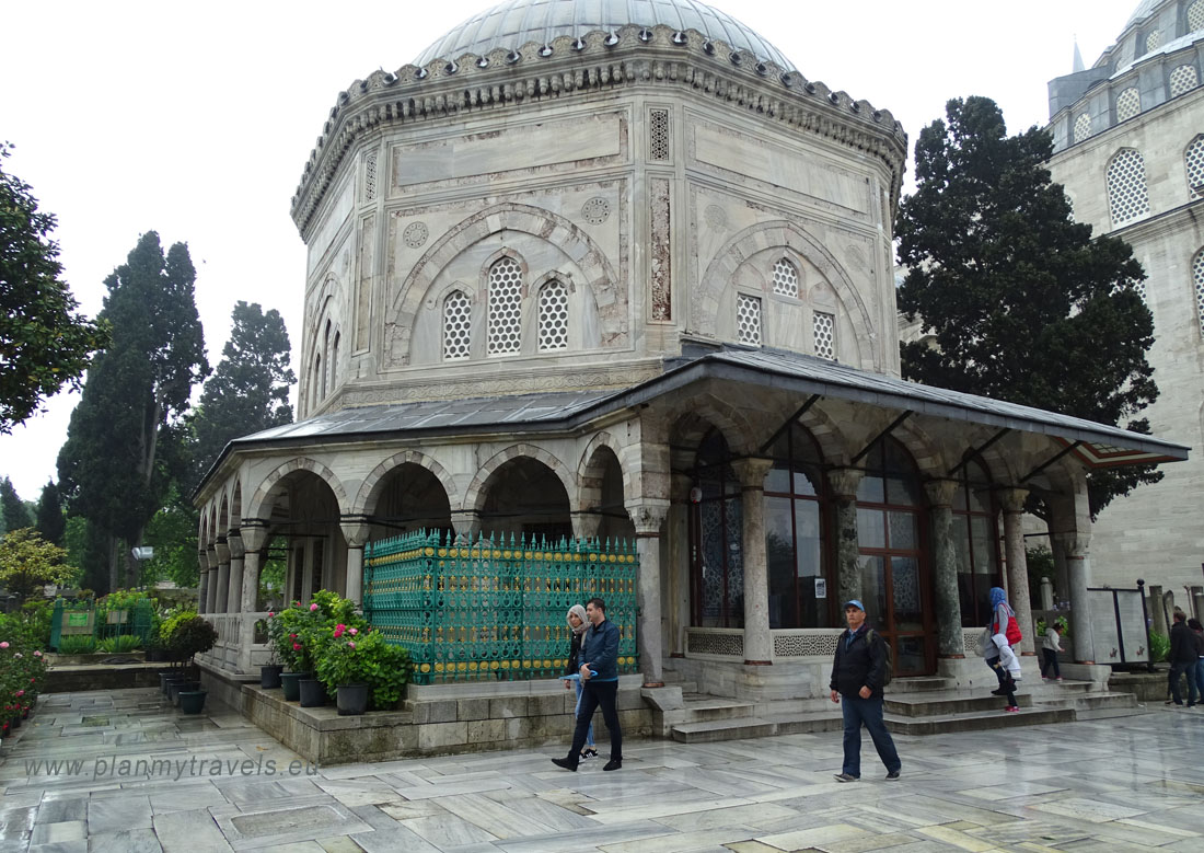 Na tyłach meczetu znajduje się niewielki cmentarz, porośnięty kwiatami Irysów. Znajduje się tu mauzoleum, w którym w 1566 roku pochowano sułtana Sulejmana Wspaniałego. Wewnątrz mauzoleum znajdują się trzy drewniane sarkofagi sułtańskie. Pochowano tu również sułtana Ahmeda II, Sulejmana II (odziedziczył władzę po Sulejmanie Wspaniałym) oraz córkę Sulejmana Wspaniałego – Mihrimah, która przeszła do historii jako najpotężniejsza księżniczka Imperium Osmańskiego. Mauzoleum jest przykryte dwiema kopułami. Kopuła środkowa jest ozdobiona kryształami górskimi. Zgodnie z legendą są tu również fragmenty Czarnego Kamienia z Mekki. Grobowiec Sulejmana można odwiedzić codziennie z wyjątkiem poniedziałków.