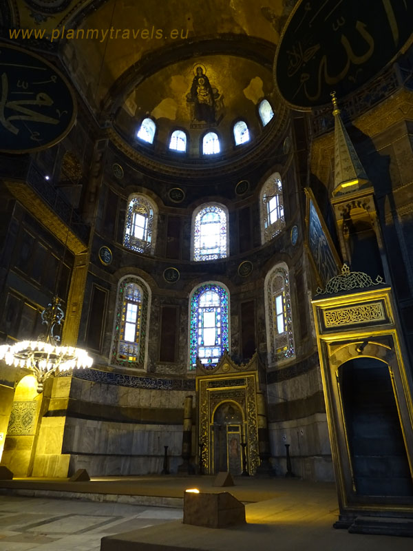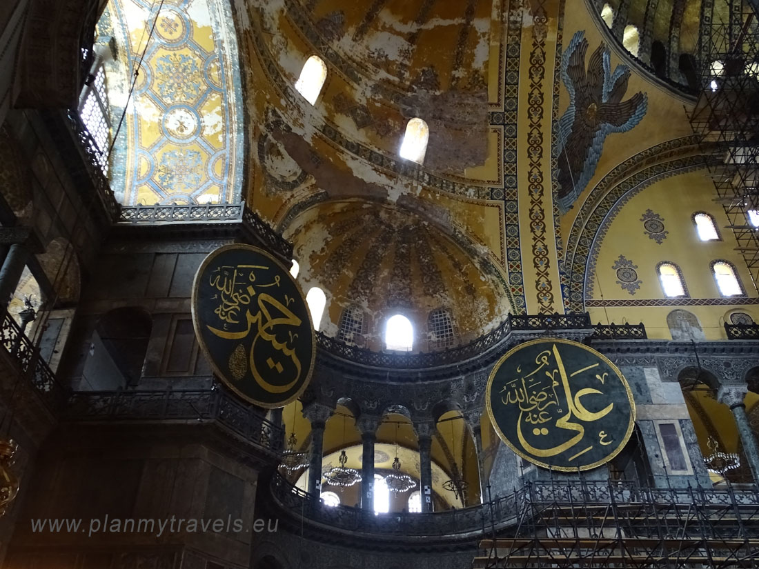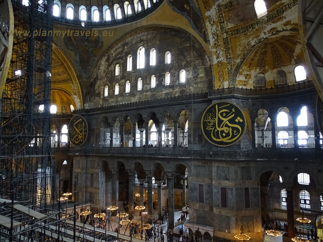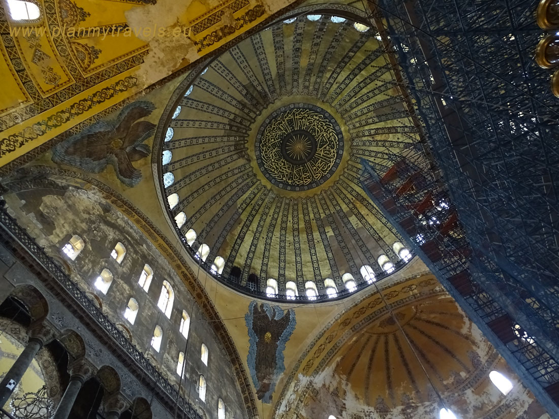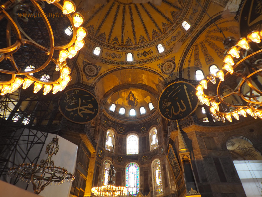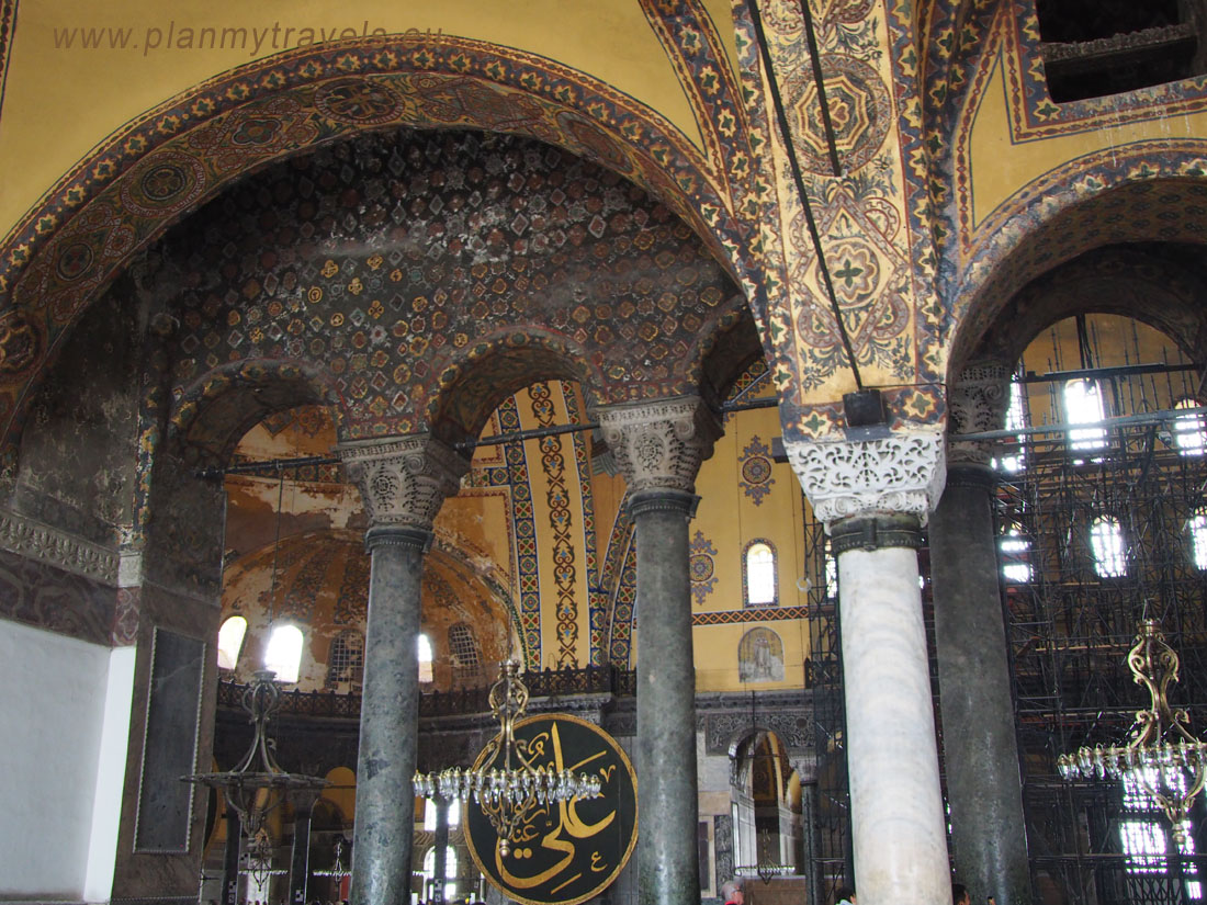 Wewnątrz warto zwrócić uwagę m.in. na złote mozaiki przedstawiające postacie świętych oraz wejść na górną galerię w kształcie podkowy, z której roztacza się wspaniały widok na nawę główną. Warto zwrócić uwagę na olbrzymi podwieszany kandelabr oraz przepiękną kopułę o średnicy ponad 30 metrów i wysokości mierzonej od posadzki – ok. 55 m. Na dolnym poziomie nawy głównej znajduje się 40 kolumn, na górnym jest ich już 64. Znaczącymi przykładami dawnego meczetu jest min. kazalnica, ozdobny wodotrysk przeznaczony do rytualnego obmywania ciała oraz osiem wiszących tarcz (medalionów) z imionami mi. Allaha i Mahometa.