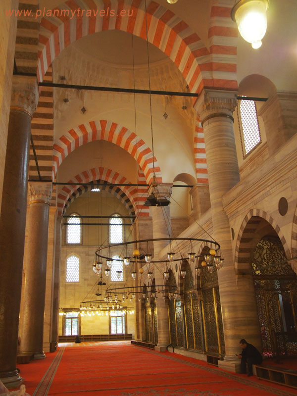 Meczet ma powierzchnię 4500 m² i jednorazowo może w nim się modlić nawet 5000 osób. Główna kopuła ma wysokość 50 m i średnicę 26,5 m, podpierają ją cztery filary i dwie półkopuły. Warto również wspomnieć, że cztery granitowe, czerwone kolumny widoczne w sali modlitewnej zostały zarekwirowane i przywiezione m.in. z Aleksandrii (Egipt) i Baalbeku (Liban). W meczecie znajduje się 136 szesnastowiecznych okien wykonanych z kolorowego szkła. Wewnątrz znajduje się również marmurowa loża dla śpiewaków i nisza modlitewna. Meczet ma również bardzo dobrą akustykę. Pomiędzy wiszącymi u sufitu lampkami oliwnymi zawieszono strusie jaja wygotowane w mieszance ziół i korzeni, mające odstraszać pająki.