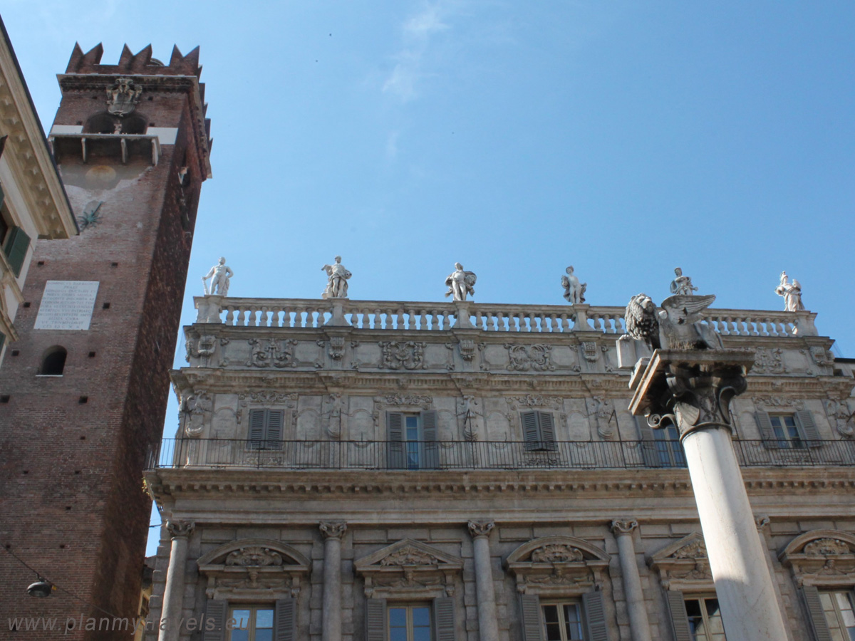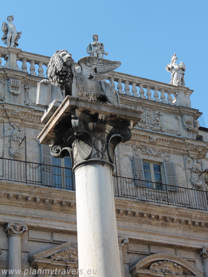 - kolumna z lwem Św. Marka, będąca symbolem Wenecji. Kolumna stoi na tle przepięknej barokowej kamienicy – Palazzo Maffei, na dachu której stoją posągi greckich bogów.